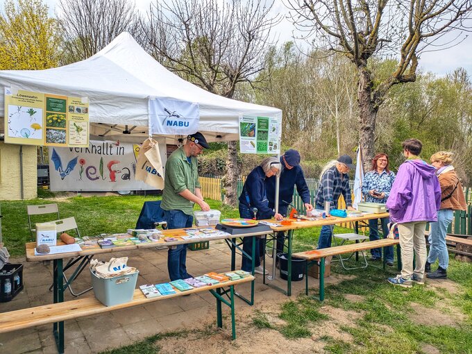 Gemeinsam bauten wir den Pavillon, Tische und Bänke auf und bereiteten das umfangreiche NABU-Informationsmaterial zum Thema naturfreundliches Gärtnern vor. Liebevoll gestaltete Infoplakate widmeten sich unter anderem dem Lebenszyklus von Löwenzahn und Brennnessel.